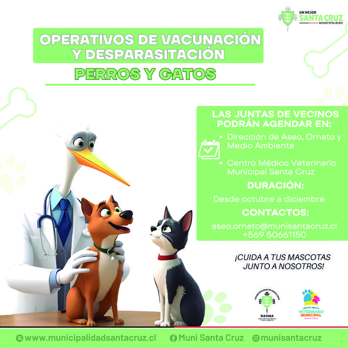 La Municipalidad de Santa Cruz informa a la comunidad que, entre los meses de octubre y diciembre, se desarrollarán operativos gratuitos de Vacunación y Desparasitación de perros y gatos, en el marco de su compromiso con el cuidado de las mascotas.