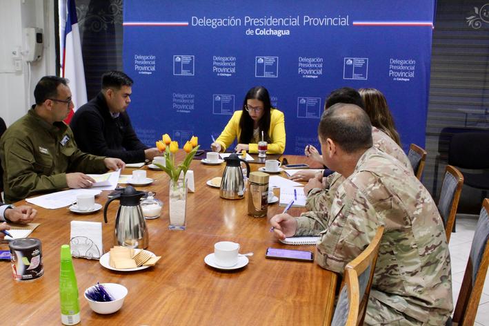 La mesa de trabajo fue encabezada por la delegada presidencial de Colchagua, Marta Pizarro Inzunza, y contó con la participación del Ejército, Carabineros, PDI, Bomberos, la Dirección Provincial de Educación y SENAPRED.