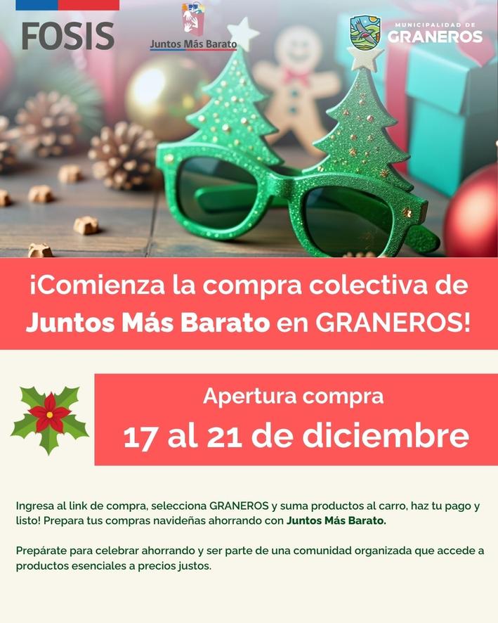 El director regional del FOSIS, Carlos Saravia Aravena, dijo que “invitamos a todas las personas de Graneros y comunas cercanas a sumarse a las compras colectivas navideñas ingresando a www.juntosmasbarato.cl. Estas fiestas son una oportunidad para fortalecer la organización comunitaria y, a la vez, acceder a precios más convenientes. Mientras más familias participen, mayor será el ahorro y el impacto positivo en cada hogar. Queremos destacar que esta iniciativa está abierta a toda la comunidad y, por tanto, no se requiere un tramo específico en el Registro Social de Hogares ni vivir en un sector determinado de la comuna”.