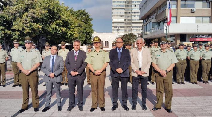 En la plaza de Los Héroes de Rancagua, el Jefe Zona O'Higgins, General Guillermo Bohle Guichacoi, presentó a las autoridades el nuevo contingente policial que reforzará la dotación de la región, para brindar más seguridad a la comunidad.