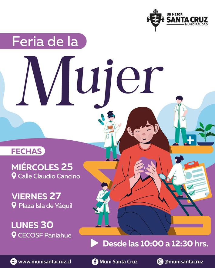 En el marco del mes de la mujer, la Municipalidad de Santa Cruz realizará la Feria de la Mujer este 25, 27 y 30 de marzo, en la zona urbana y rural de la comuna, con integración de diversos servicios, pensados en entregar bienestar, cuidado y asesoría integral.