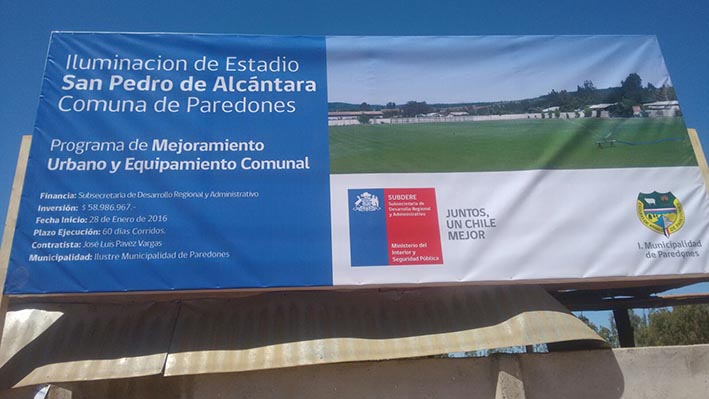 La Ilustre Municipalidad de Paredones postuló a un proyecto que lleva por nombre "Iluminación Estadio San Pedro de Alcántara". Este proyecto está financiado por La Subsecretaría de Desarrollo Regional y Administrativo SUBDERE, por un monto de $58.986.967. La obra fue contratada el 25 de enero del 2016, los trabajos comienzan en San Pedro de Alcántara.