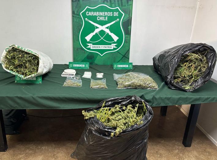 En el procedimiento se logró la detención de una persona de 46 años, con antecedentes policiales; y la incautación de 17 kilos 836 gramos de marihuana elaborada, 7 plantas de cannabis sativa con una altura de 1.50 mts 2.20 mts., 1 pesa digital y elementos para dosificar.