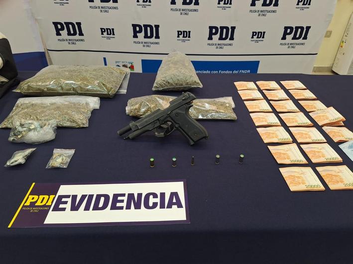 En coordinación con el Ministerio Público, se llevó a efecto el procedimiento policial en donde se logró la incautación de más de 2.500 gramos de cannabis, más de 100 gramos de clorhidrato de cocaína; dos armas, munición de diverso calibre, más de 9 millones de pesos en dinero en efectivo, dos vehículos y otras especies asociadas a la dosificación y pesaje de la droga.